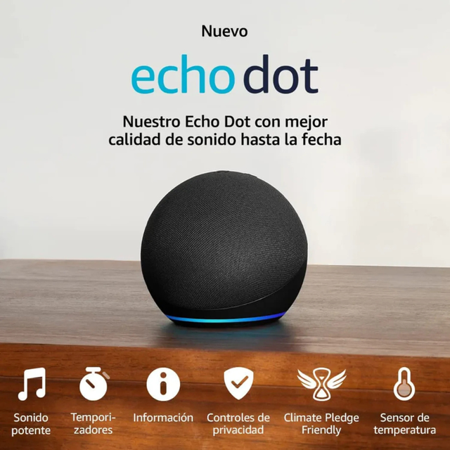 El diseño elegante y compacto del Echo Dot 5ta Gen se adapta perfectamente a cualquier espacio de tu hogar. Su nuevo sensor de temperatura permite automatizar rutinas, como encender el ventilador si la habitación está muy caliente. Además, la función de detección de movimiento (en modelos seleccionados) activa funciones inteligentes cuando entras a una habitación.